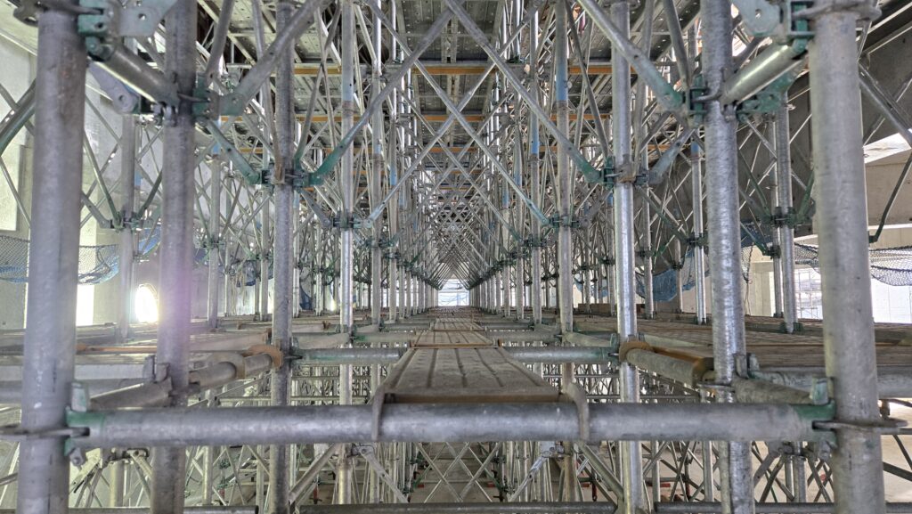 吹き抜け部に設置する内部足場は、安全性・設置基準・作業性を満たすように施工されています。簡潔な架構が整然と連続し、計画的にデザインされた構造物のような印象を与えています。