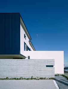 南北軸上に2層のBOX、それに直行する東西軸上の1層の2つのBOXを配し、それらのBOX内の諸室が、パブリックスペースからプライベートスペースヘとスムーズにながれるよう、空間を段階的に構成させています。